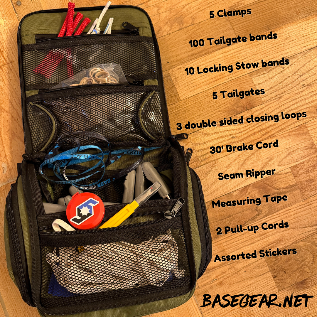 5 Clamps, 100 Tailgate bands, 10 Locking Stow bands, 5 Tailgates, 3 double sided closing loops, 30' Brake Cord, Seam Ripper, Measuring Tape, 2 Pull-up Cords, Assorted Stickers.